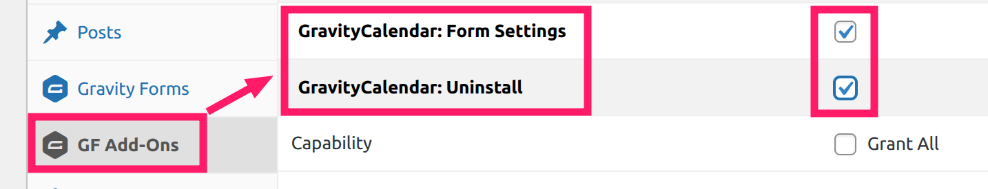 If the GravityCalendar tab is missing from Gravity Forms form settings, or the calendar creation screen shows a blank page, this is usually caused by missing capabilities on your WordPress role.